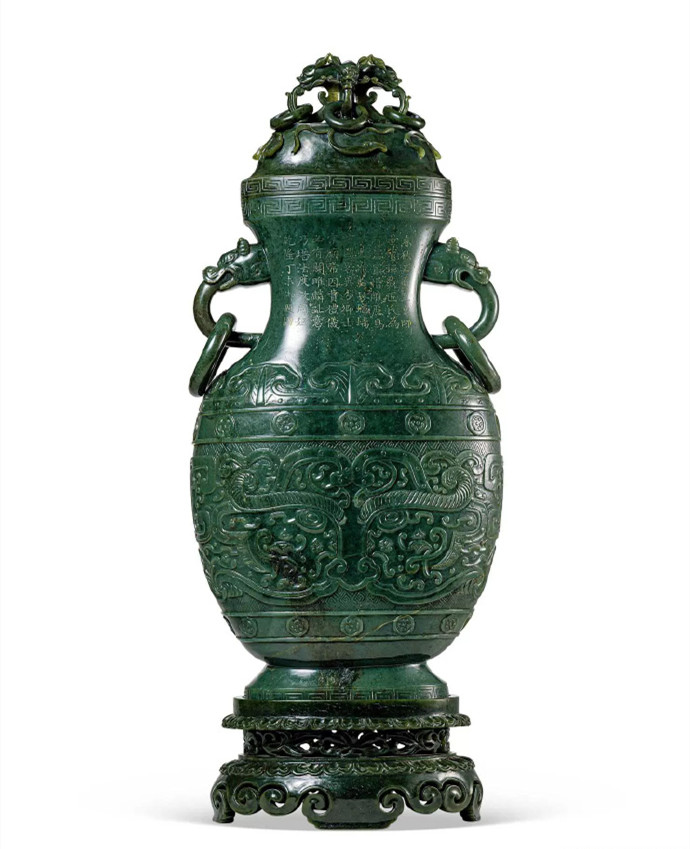 瓶碧玉质,细腻温润,通体色泽均匀。高55厘米,器口呈椭圆形,有盖。盖沿饰回纹一周,盖面饰绶带云纹,顶镂雕四龙首,各衔一环。龙首雕刻细腻,龙须等细节清晰可见,活环线条流畅,可自由转动。瓶口微撇,边饰回纹,颈略收,正面雕刻有乾隆帝《咏和阗玉仿周蟠螭壶》御制诗一首:「春秋玉贡至京师,量质恒教匠氏为。玩器最憎雕丽鸟,古壶雅合琢蟠螭。方圆略异分卿士,宗庙常因赞礼仪。必有关雎麟趾意,乃堪法度效周姬。」落款「乾隆丁未御题」,钤印「比德」,表达了乾隆皇帝对古雅艺术风格的喜爱,强调了玉器在礼仪文化和道德传承方面的重要性,笔法遒劲、布局工整,体现了皇家玉器特有的文化底蕴。两侧各雕一龙首衔活环。肩饰如意纹。壶腹扁圆,体琢周带,以涡纹为边,其间以压地隐起技法琢兽面纹,眉骨突起,双目炯炯,威严凝重,刻画细腻,颇具镇压百邪之威仪,周围环绕如意云纹和雷纹,整体布局紧凑且富有韵律,衬托出古朴庄重的氛围。椭圆形圈足,边饰回纹,底心阴刻「乾隆仿古」描金款。配同料双重莲瓣纹座,束腰镂雕花卉纹,下承祥云纹足,纹饰流畅自然、层次丰富。