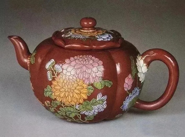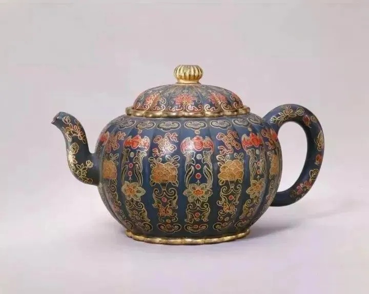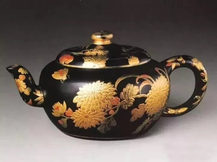 在所有的宫廷紫砂器中,乾隆时期紫砂器是最浓墨重彩的一笔。此时期,紫砂茶具一改前朝风格,从内敛、精致、考究,变为极度的铺张、繁缛,奢华得令人窒息。 ▲清乾隆 御制紫砂描金山水诗文圆壶 ▲紫砂绿地描金瓜棱壶 清乾隆 ▲乾隆 黑漆描金菊花图紫砂胎茶壶