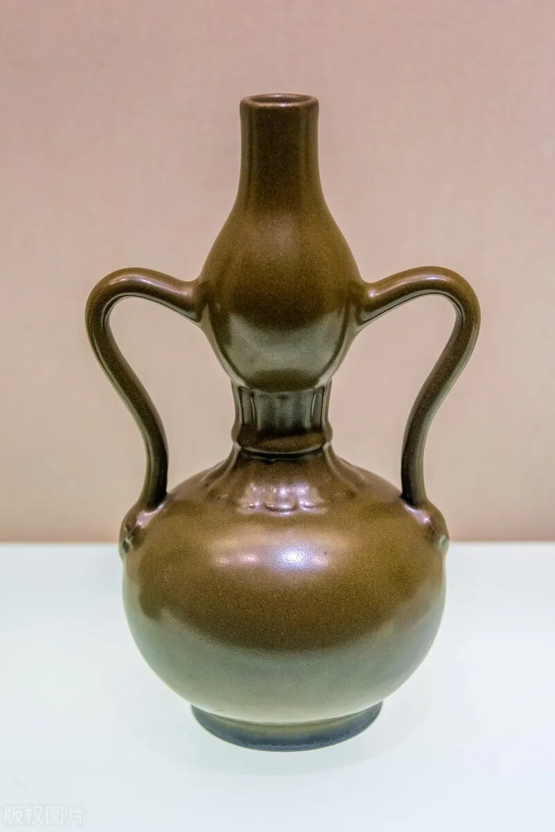 年希尧在雍正元年被皇帝起用为广东巡抚,雍正三年四月,擢升工部右侍郎,十二月因年羹尧案被罢官。雍正四年,再次起用为正二品内务府总管。后累加管理淮安板闸关、宿迁关、浒墅关税务要职,当时国家税务一半以上都归他管理。雍正十二年,加从一品左都御史衔,监察京城百官。整个雍正一朝,年希尧可谓官高职要。年窑几乎就是雍正官窑的代名词,但其实际管理者却是唐英。图为乾隆茶叶末釉双耳葫芦瓶,又称厂官釉。