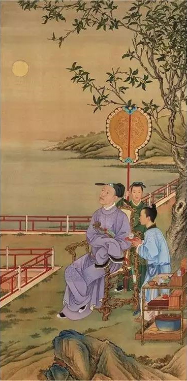 这幅《高宗赏月图》我们可以看到一片水上沙洲,江上一轮明月悬在中天,近处江上水榭,山石旁桂树下坐着一人,他身着汉人服饰手里拿着一柄如意,如果不说他是乾隆还真不太好猜,他翘着脚,显得怡然自得,抬头望向天上明月。他的身后有一个仆人打着障扇,身旁则有另一个仆人捧着一个红色描金漆盘,上面放置着一个小巧的青花盖碗。