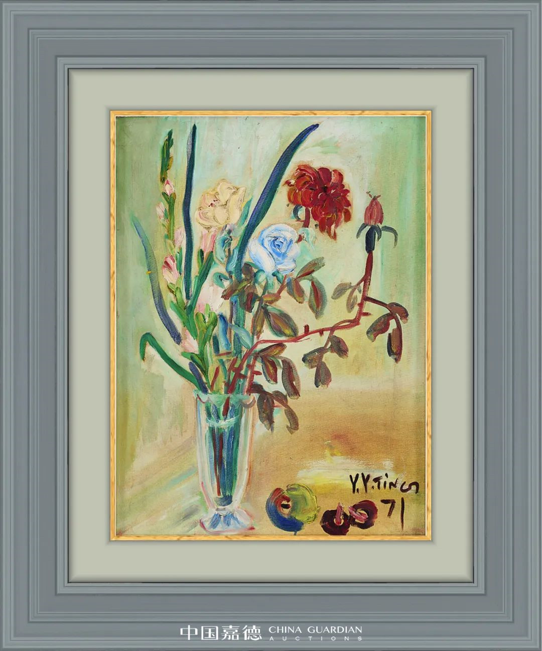 作为中国现代美术的开拓者,丁衍庸融合野兽派和中国传统绘画的鲜明风格在20世纪的中国艺术中独树一帜。《瓶花》是拍场上罕有的丁衍庸花卉油画代表,玫红、浅蓝、鹅黄点缀着春风中花和叶的喜悦,明丽的色彩和空灵和谐的构图,展现出艺术家晚年对色彩搭配掌握之成熟,以及创作时艺术家精神上的愉悦富足与心境的豁达。丁衍庸艺术生涯仅300余幅油画,其中花卉题材不到20幅,除香港中文大学文物馆等公共机构收藏之外,可供私人领域流通之作寥若晨星,本次上拍《瓶花》即为丁公晚年少有的抒发畅快心境之代表作,首现拍场,极为难得。