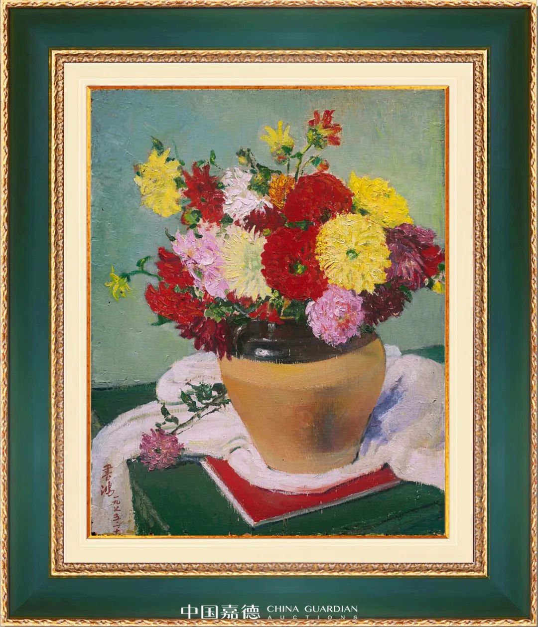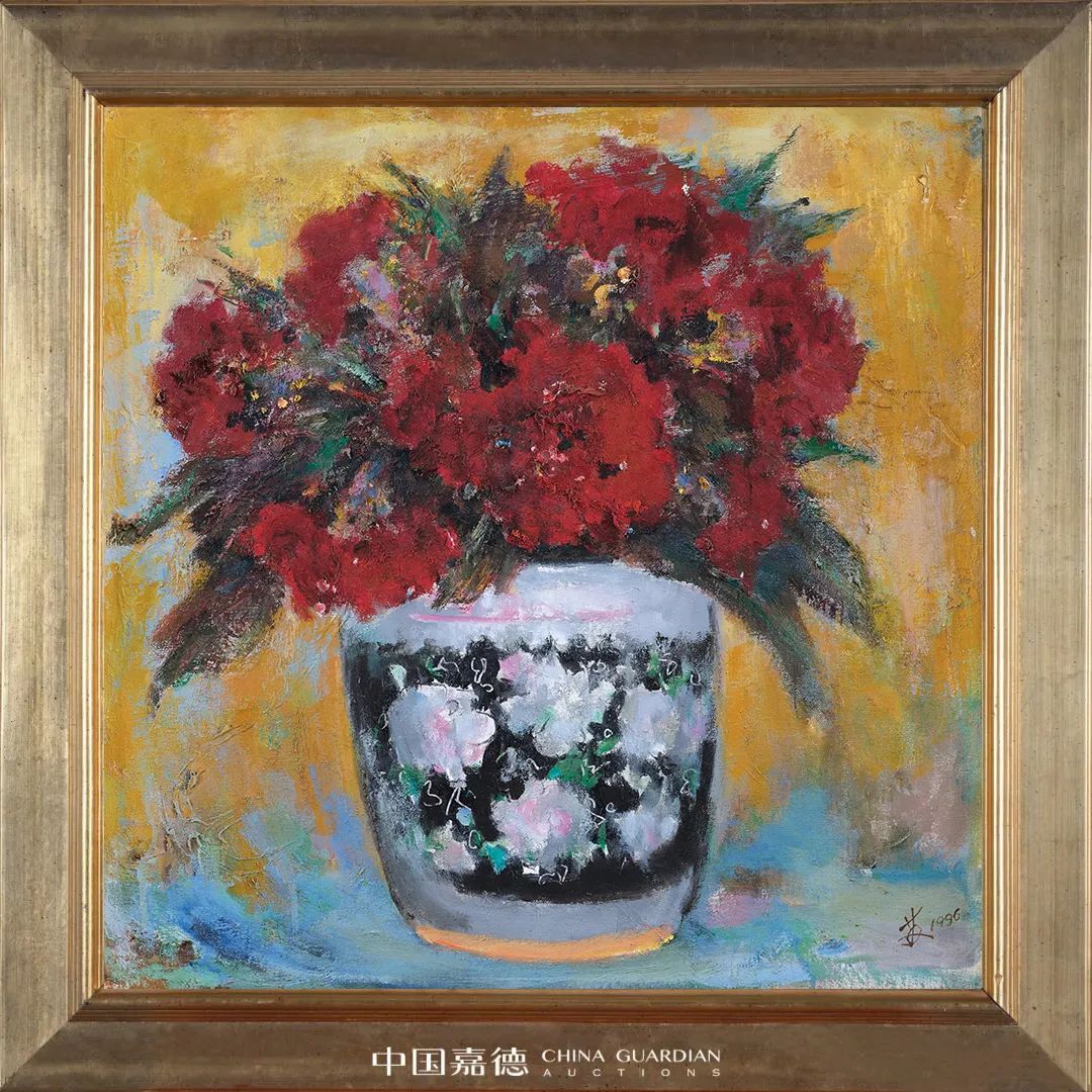 提起常书鸿,更多的人知道他是研究敦煌艺术的专家,然而在敦煌的研究与保护之外,常书鸿的油画在近现代中国油画史上,同样有着无可争辩的地位。《阅尽人间春色》便是常书鸿静物油画中不可多得的代表,其笔下的“大漠之花”,在浓烈的笔触及色彩之下闪耀着敦煌艺术的民族精魂。相比常书鸿其他花卉作品,本作在色彩和笔力上尽显雄风,展现出纷华不染之高雅气质,粲然如繁星丽天。而本作也是艺术家赠给其子的留念之作,铭记了一位父亲对子辈的美好祝愿,以及对即将到来的时代曙光的期盼。本作来源凿凿、大方端丽。又鉴于目前市场中能流通的常氏油画寥寥,精品更是罕见,也令这件花卉更显珍贵。