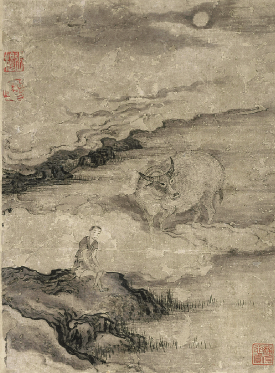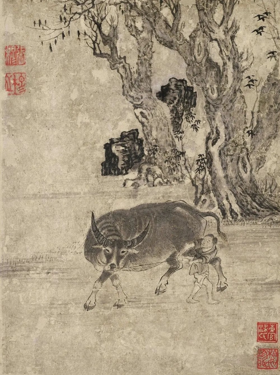 在这段题跋中,澹归和尚特意指出尽管张穆受人所托而画牧牛图,但他的牛并无绳索牵制。澹归解释,如果顾着牵牛以致鼻绳拽断,那就更不能牧牛了,还不如抛绳不顾(不牵制),全凭自身的领悟,无为而有所为。王令约于公元1670—1681年间到广东任官,与晚年的张穆多有交往。他也提道:“曾见《牧牛图》赠阿大士(释今无),烟岚顿随垄亩而生,若鼻孔撩天,牛绳俱失,不复问牧子矣。”由这段文字可知,张穆为其好友今无和尚也画了一幅依然是没有牛绳牵制的牛。张穆画牛的作品存世不多,但《牧牛图册》与澹归和尚、王令记载的牧牛图足以证明,张穆不仅曾数次绘画牧牛图且对“牧牛”在禅宗典籍中的含义相当熟悉。他并未完全按照颂偈的内容作画,显示了他对禅宗“牧牛”有其个人见解。