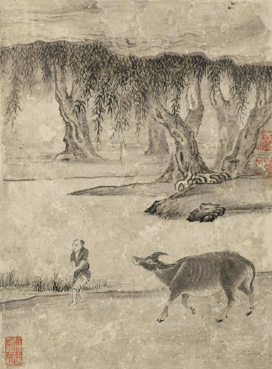 明末清初张穆的《牧牛图册》,当以其时盛行的普明禅师《牧牛图颂》为蓝本,而又有所创作发挥。张穆《牧牛图册》每一帧所表现的人与牛互动的情节与刻本一致。但对比两种“牧牛图”,首先,不难发现张穆的《牧牛图册》明显缺失了禅宗对“牛”(人心)从全黑到全白的渐变过程,仅在第八幅“相忘”中,绘以全白的牛,暗扣解题偈语“白牛常在白云中”。其次,张穆笔下的山水背景,诸如树木、山石以及牧童短衣短裤的打扮,均有岭南乡村的感觉。李焕真女士也因此认为张穆描绘的是岭南乡间牧牛的情景。由此可见,画家在参考典籍的同时,融合了自身对佛学的理解以及个人的艺术创作经验、生活体验。