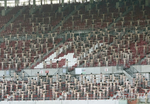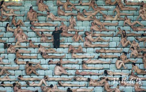 ▲2008年5月12日报道 奥地利维也纳的Ernst Happel足球场是今年欧洲足球锦标赛决赛场地。5月11日,大约1800人聚集在这里参加活动,有趣的是这些人都没穿衣服。
