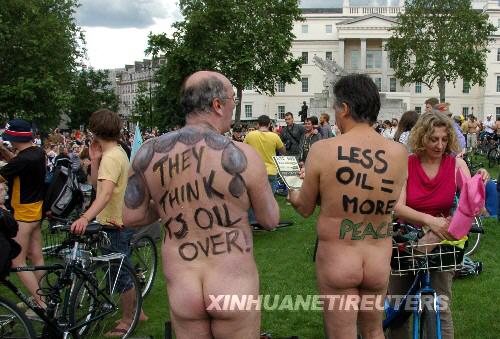 ▲2008年6月14日,两名裸体男子参加在英国首都伦敦海德公园举行的裸体骑车活动。当天,伦敦数百名市民在议会大厦和海德公园等主要景点裸体骑自行车环游,呼吁环保,反对过度依赖汽车。