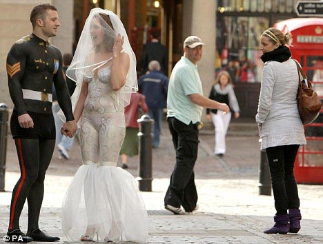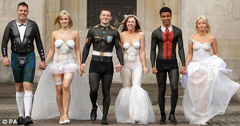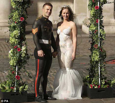 ▲几乎每个人都希望自己能够拥有一场完美的婚礼,而对于那些囊中羞涩的人来说要想完成这个心愿就要付出一些代价。日前英国的三对恋人就参加了由GMTV举办的一场真人秀,几对竞争者要在众目睽睽之下站在闹市区赤身裸体,身上除了彩绘图案之外只能穿着少量起到装饰作用的衣物,除此之外他们还要在两周的时间内接受更多挑战,获胜者则可以举办一场他们梦寐以求的奢华婚礼,费用由GMTV埋单。