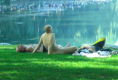 ▲2007年9月9日上午,前来游玩的几个老外来到颐和园,不顾周围还有游人,竟“光溜溜”躺在湖边草坪上。不多一会儿,警察来了,把那几个“光溜溜”的老外带走了,怎么处理,不得而知。
