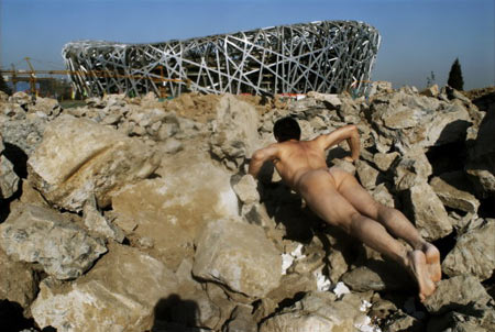 ▲区志航用裸体俯卧撑与鸟巢”对话”。