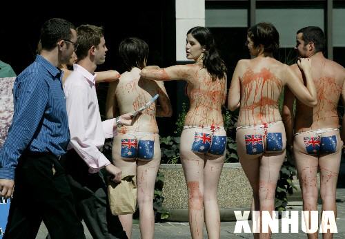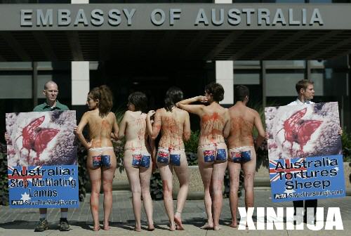 ▲2005年9月27日,美国善待动物组织成员在华盛顿澳大利亚驻美使馆前抗议澳羊毛生产者为提高羊毛产量而虐待绵羊。动物保护者说,澳大利亚的羊毛生产者为了提高羊毛的质量和产量,采用极不人道的手段来对待动物,在不使用麻醉药的情况下,切下绵羊尾巴附近的一切皮肤,绵羊因此受伤流血,痛苦不堪。