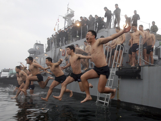 ▲2010年1月20日,韩国潜水部队的士兵在镇海进行冬季训练。