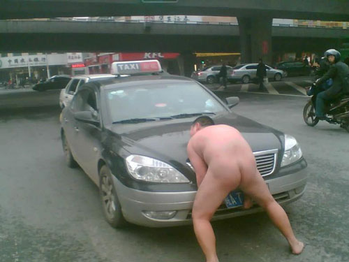 ▲“2010最强环保卫士——力量哥诞生!”,日前,网友“516116”在猫扑大杂烩发帖爆料,称上周日在合肥市区街头见到雷人一幕,一男人全身赤裸,挡在马路中间不同的车子前抬车,不时高喊“给我力量”,引起不少“不明真相的人”的围观,造成交通拥堵,有人以为是玩行为艺术,也有人说可能是赌博输钱了搞得精神出了问题,后来经过警察的配合才将该男子送到急救车上,当照片发到网上后,还被转到百度贴吧、红网论坛等网站,在网上也引发了数十万网友的围观潮,一时间“力量哥”爆红网络。