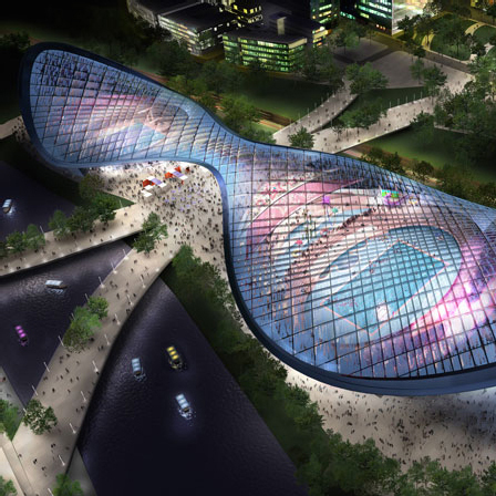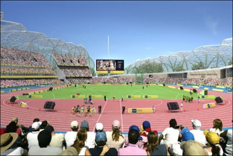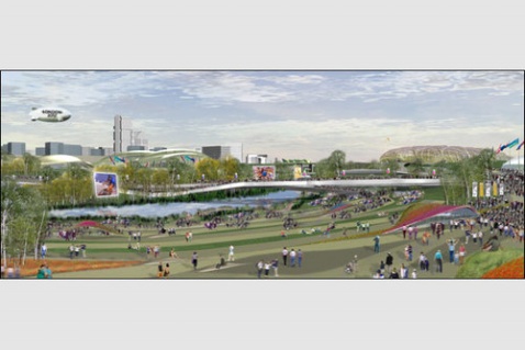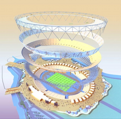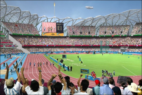 伦敦2012年奥运会主场馆设计蓝图。这一被认为是欧洲最大规模工程之一的方案由伦敦奥运交付管理局(Olympic Delivery Authority)策划,在2008年4月动工,2012年投入使用。据伦敦奥运会有关负责人Tessa Jowell说,这个项目将建于伦敦东区,也就是伦敦贫困区之一。这一主场馆面积将达到600英亩(约250公顷),馆内共设8万张座位。