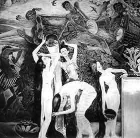 ⑥公共场所出现裸女画 北京新机场大楼的壁画《泼水节——生命赞歌》出现全裸的女性画像。要不是画的是少数民族,还略带抽象,估计有人恨不能立即把画家袁运生当作高级流氓送进秦城监狱。谁都得佩服北京人的精神,那么远的机场,能走得动的一半儿都去看了。