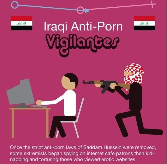 尽管由萨达姆.侯赛因制定的严厉的反色情法律已经被取缔,但是一些极端分子却也开始在网吧监视他人,一旦发现浏览色情网站就被绑架然后一顿毒打。