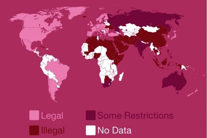 从左到右从上之下图例依次为:色情合法化、一定程度限制、非法和无数据。(看看兲朝和日本就懂了!)