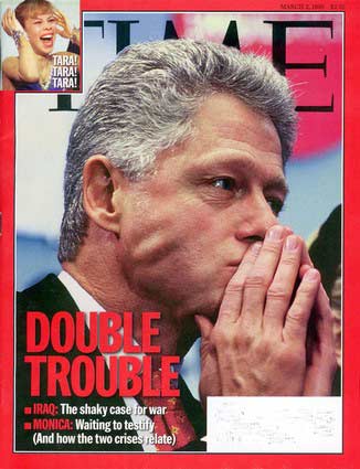 比尔·克林顿能被《时代周刊》杂志评选为“年度人物”自然是幸事。不过比尔·克林顿出现在1998年3月份的杂志封面上,头上却多了两个“兽角”(字母M),不禁让人产生联想。