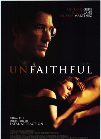 18、《不忠》(2002)。爱德华(理查·基尔饰)和康妮(戴安·莱恩饰)是一对令人艳羡模范夫妻,他们和八岁的儿子一起住在纽约郊区的一所别墅里,过着无忧无虑、幸福美满的生活。一天傍晚,康妮在去接儿子的路上邂逅了一位充满异域风情的浪漫男子,他轻易的就征服了康妮的心,尽管充满了愧疚,但康妮还是义无反顾的投入到了陌生男子的怀抱。他们在一起度过了充满激情的几个小时。 康妮满怀不安的回到了家,虽然她巧妙的隐瞒了这一段瞬间的激情。但她忘记接儿子回家的事实,加上丈夫对妻子的了解,使细心的爱德华发现了端倪。他雇用私人侦探,去探查这一切的背后,终于发现了那个让他痛苦的事实。
