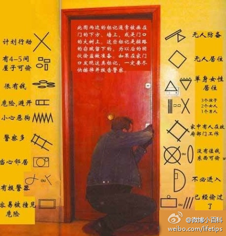 小偷踩点六种常用标记:1.“+ -”家里白天有人,晚上没人;符号倒过来,就是晚上有人,白天没人;2.“⊙”单身或租户;3.“...”家庭成员三个人;4.“√”已进入过;5.“☆”目标;6.“×”非目标。警方提醒,家门口出现奇怪符号,应尽快檫掉。年底了,小偷要创收,转发给朋友提个醒。