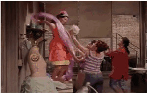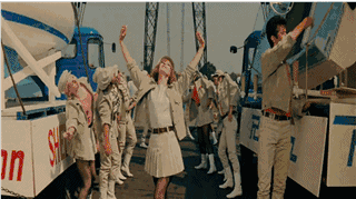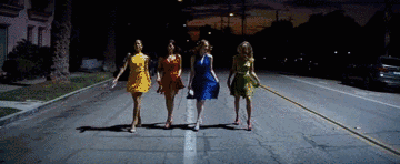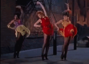 《爱乐》里也来了这样一段,米娅和几个舍友每人一抹亮色,同样在街上一字排开,挥舞着热辣的裙摆。那几下小快步,学得真像啊。