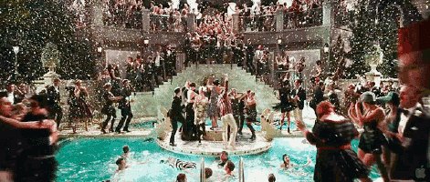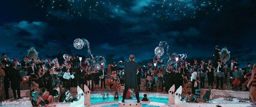 场景更加壮观,盖茨比的大豪宅像城堡死的,泳池派对的奢靡程度堪比海天盛筵。