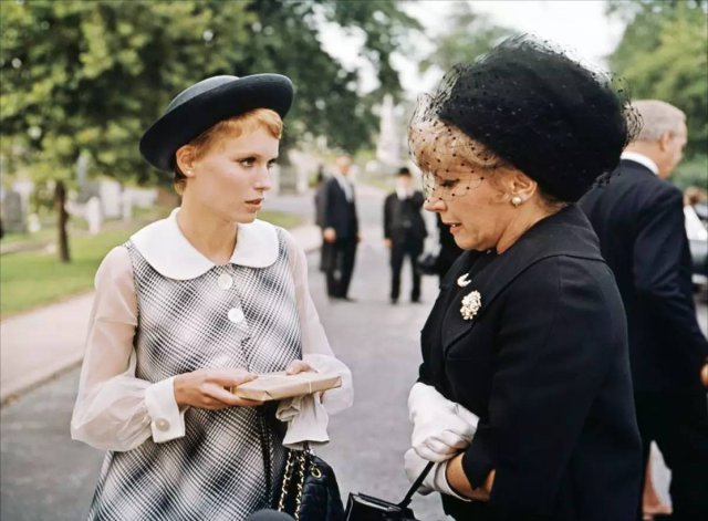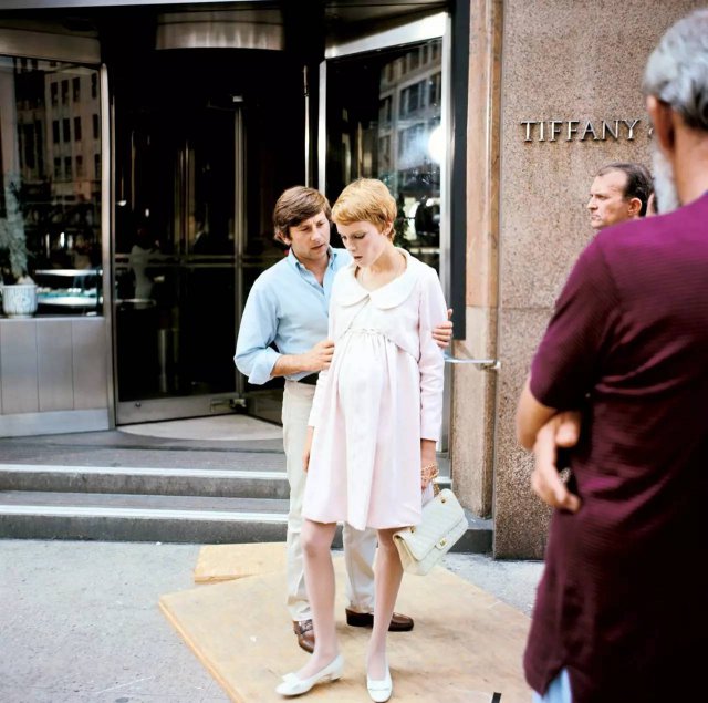 米娅 · 法罗本人也碰巧正好怀孕了,电影里主要穿的都是 Peter Pan 小圆领的超高腰 A 字娃娃裙。她的精灵头也是因为这部电影成了现象级发型的。