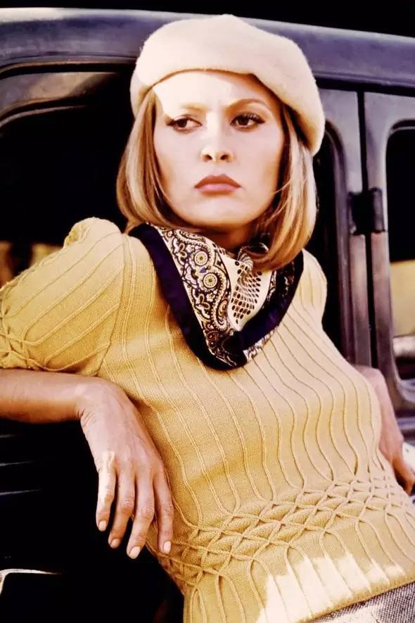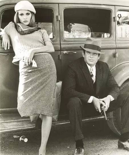 电影的经典造型是 Bonnie 靠在车上,戴着贝雷帽围着三角巾。一个盗贼穿这样像话么?