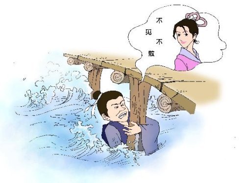 春秋时,鲁国曲阜有个年轻人名叫尾生,与圣人孔子是同乡。尾生为人正直,乐于助人,和朋友交往很守信用,受到四乡八邻的普遍赞誉。后来,尾生迁居梁地(今陕西韩城南)。他在那里认识了一位年轻漂亮的姑娘。两人一见钟情,君子淑女,私订终身。但是姑娘的父母嫌弃尾生家境贫寒,坚决反对这门亲事。为了追求爱情和幸福,姑娘决定背着父母私奔,随尾生回到曲阜老家去。那一天,两人约定在韩城外的一座木桥边会面,双双远走高飞。黄昏时分,尾生提前来到桥上等候。不料,六月的天气说变就变,突然乌云密布,狂风怒吼,雷鸣电闪,滂沱大雨倾盆而下。不久山洪暴发,滚滚江水裹挟泥沙席卷而来,淹没了桥面,没过了尾生的膝盖。