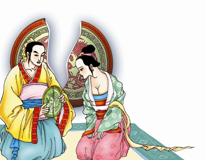 原来,乐昌公主与丈夫徐德言两心相知,情义深厚。陈国将亡之际,徐德言曾流着泪对妻子说:“国已危如累卵,家安岂能保全,你我分离已成必然。以你这般容貌与才华,国亡后必然会被掠入豪宅之家,我们夫妻长久离散,名居一方,唯有日夜相思,梦中神会。倘若老天有眼,不割断我们今世的这段情缘,你我今后定会有相见之日。所以我们应当有个信物,以求日后相认重逢。”说完,徐德言把一枚铜镜一劈两半,夫妻二人各藏半边。徐德言又说:“如果你真的被掠进富豪人家,就在明年正月十五那天,将你的半片铜镜拿到街市去卖,假若我也幸存人世,那一天就一定会赶到都市,通过铜镜去打问你的消息。”