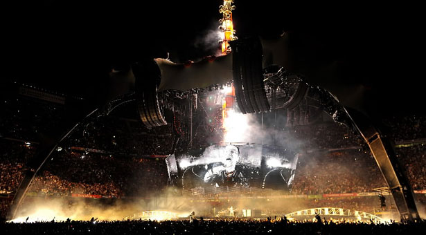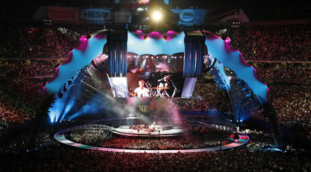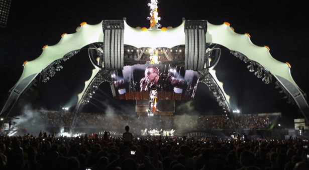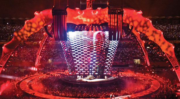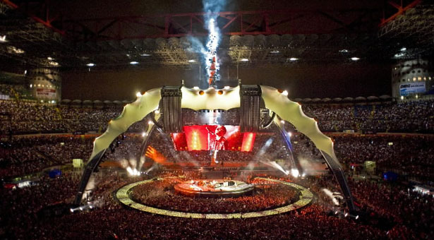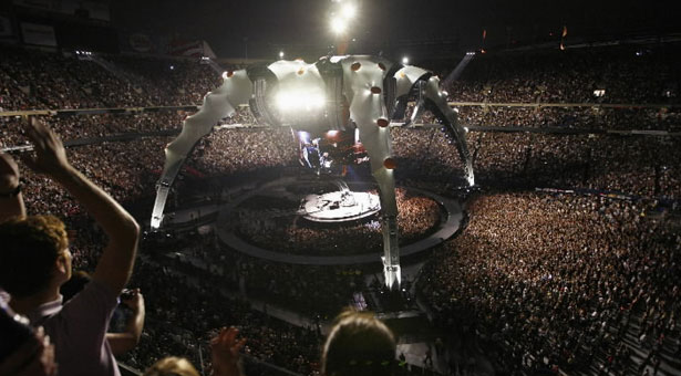 U2摇滚乐队在新泽西州的巨人体育场举行的演出 是巨人体育场有史以来举办的一场最大的演唱会。这场演唱会利用了体育场的造型在中间搭建了一个360度旋转的中央舞台,特别是舞台的搭建构造采用了在星球大战上才能欣赏到的“巨爪”设计,再加上圆柱视频的包装效果,使它变成了现场歌迷疯狂和尖叫的催化剂,也为现场粉丝奉献了一场由技术结合创新打造的全新视觉效果,真可谓是精彩绝伦。