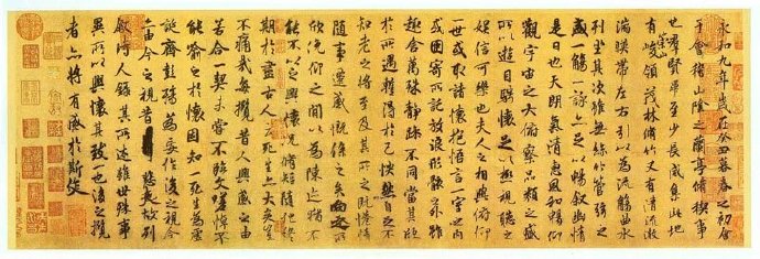 右军将之传给子孙,直至七代孙智永,遗付给辩才,后来被唐太宗「骗」入内廷,唐太宗对他的字着迷不已,曾命搨书人赵模等各搨数本赐给王、臣、真迹则陪他殉葬在昭陵了。武后时,韫桓掘发,真迹又复出,收入玄宗内府,且刻石置于学士院,称为「定武兰序」,经历宋、金而亡。但此本和今天流传下来的墨本各不相同,很难确定究竟原来是什么样子 .