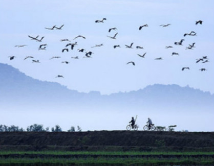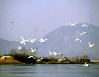 古城的沙滩在粼粼波光轻吻下苏醒,而天际御风的大雁,