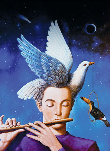 (他吹排箫,然后把鸟笼从背上卸下)