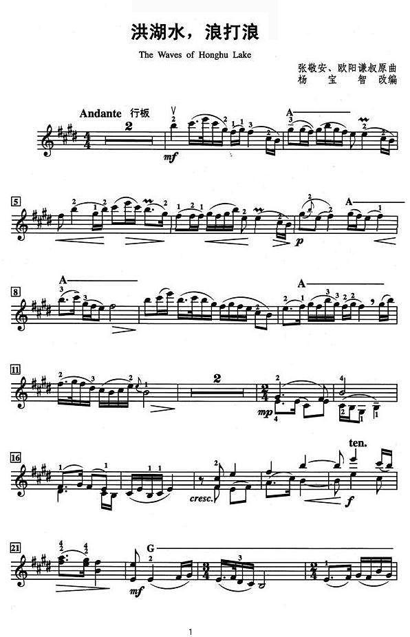 杨宝智改编的小提琴分谱《洪湖水浪打浪》: