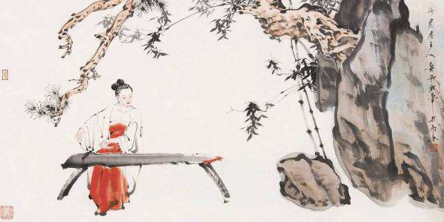 卢仝《风中琴》:五音六律十三徽,龙吟鹤响思庖羲。一弹流水一弹月,水月风生松树枝。