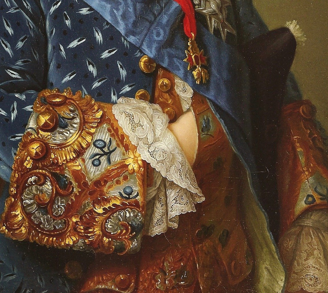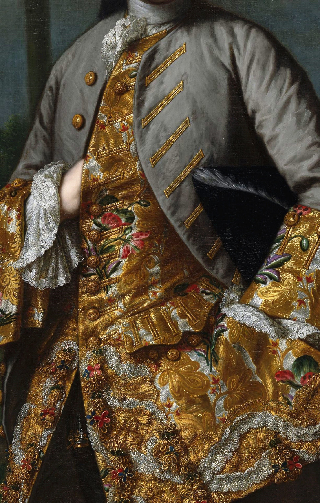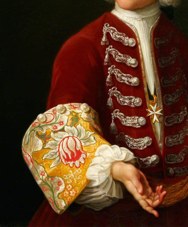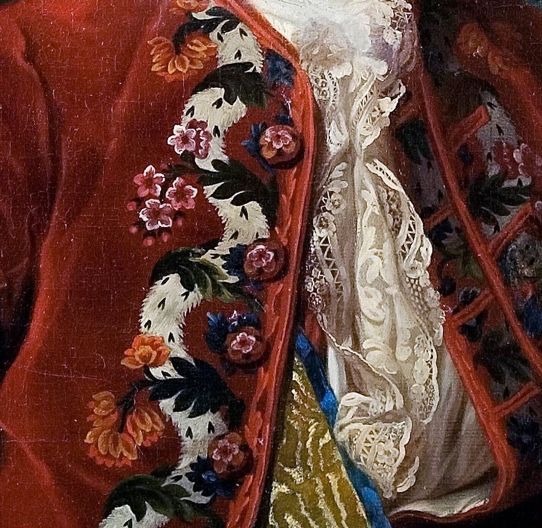 18世纪的肖像画中,绅士贵族服装上华丽的刺绣与装饰细节。