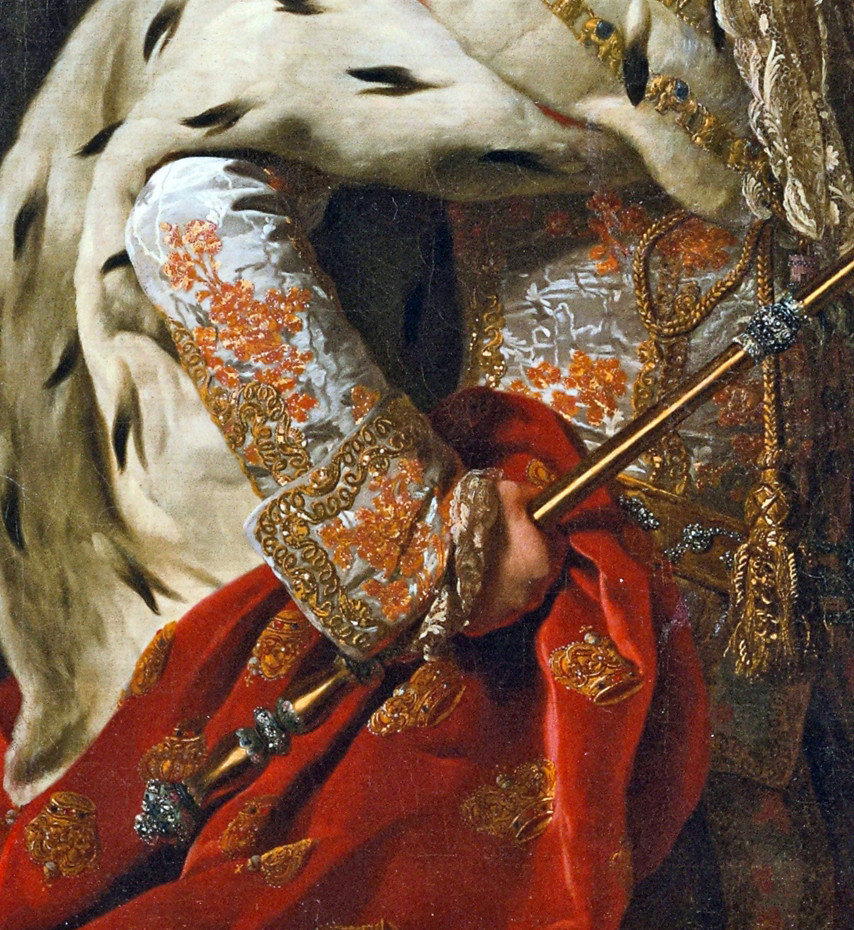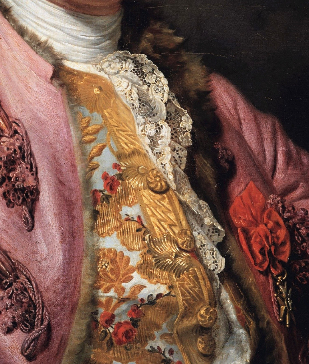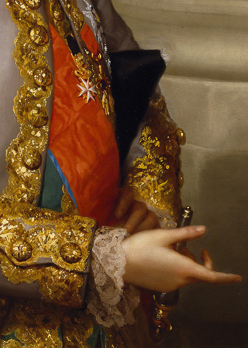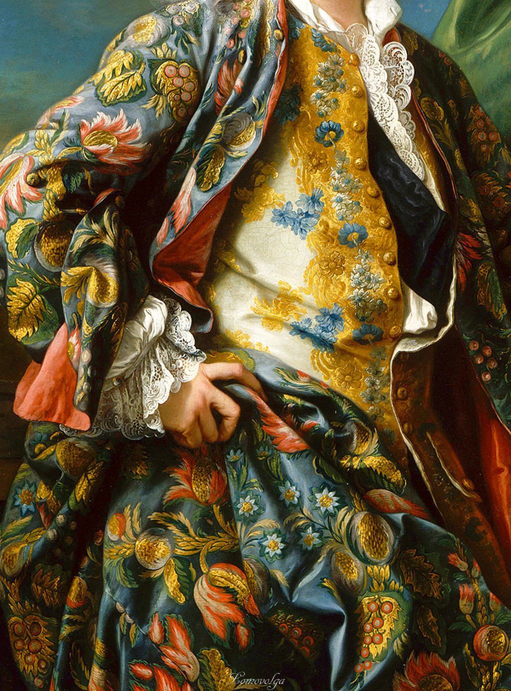 18世纪的肖像画中,绅士贵族服装上华丽的刺绣与装饰细节。
