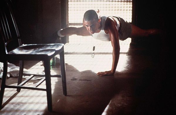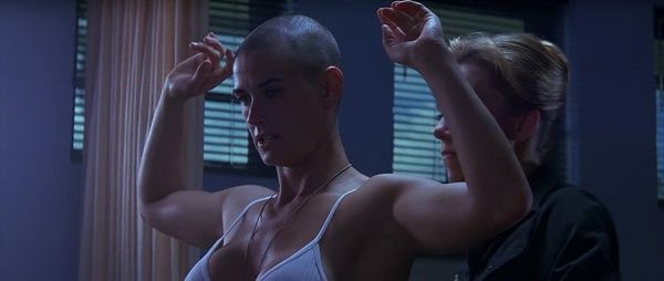 黛咪·摩尔为她心仪的“女兵简”剪掉了秀发,以近乎光头模样示人,原本优美的姿态被隐藏起来,展示出的却是强壮的体魄、结实的肉体、坚定的眼神。这样的造型谋杀了男女之间的界限,丢弃了女人天生的柔弱,连黛咪·摩尔都能比男人强出好多倍。
