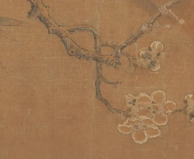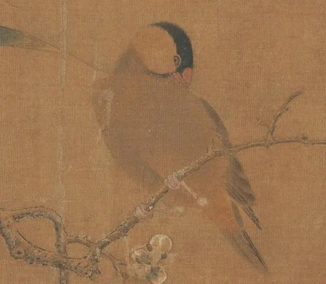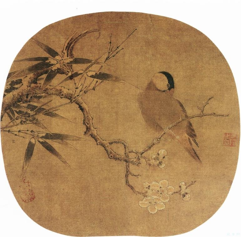 此图写红梅翠竹,残雪未消,寒雀刷羽枝头,神态生动。竹梅为双钩填彩,而雀则用细毫写羽毛,写实逼真。