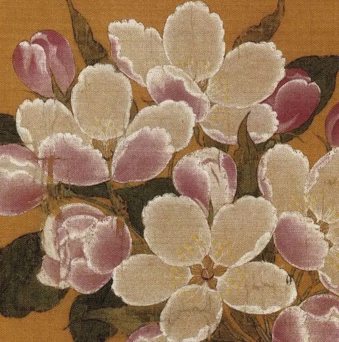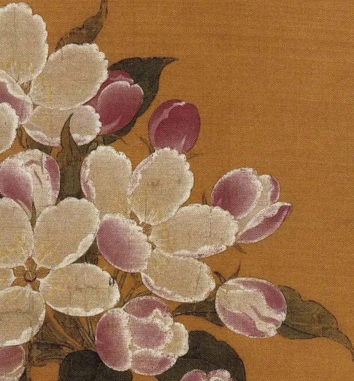 画中有西府海棠一枝,其花或灼灼盛开,或含苞欲放,花之设色,白粉为底,罩以胭脂红,勾画晕染,工整细致,清丽端雅,娇柔可人,栩栩如生,颇有苏东坡《海棠》诗“只恐夜深花睡去,故烧高烛照红妆”之感。