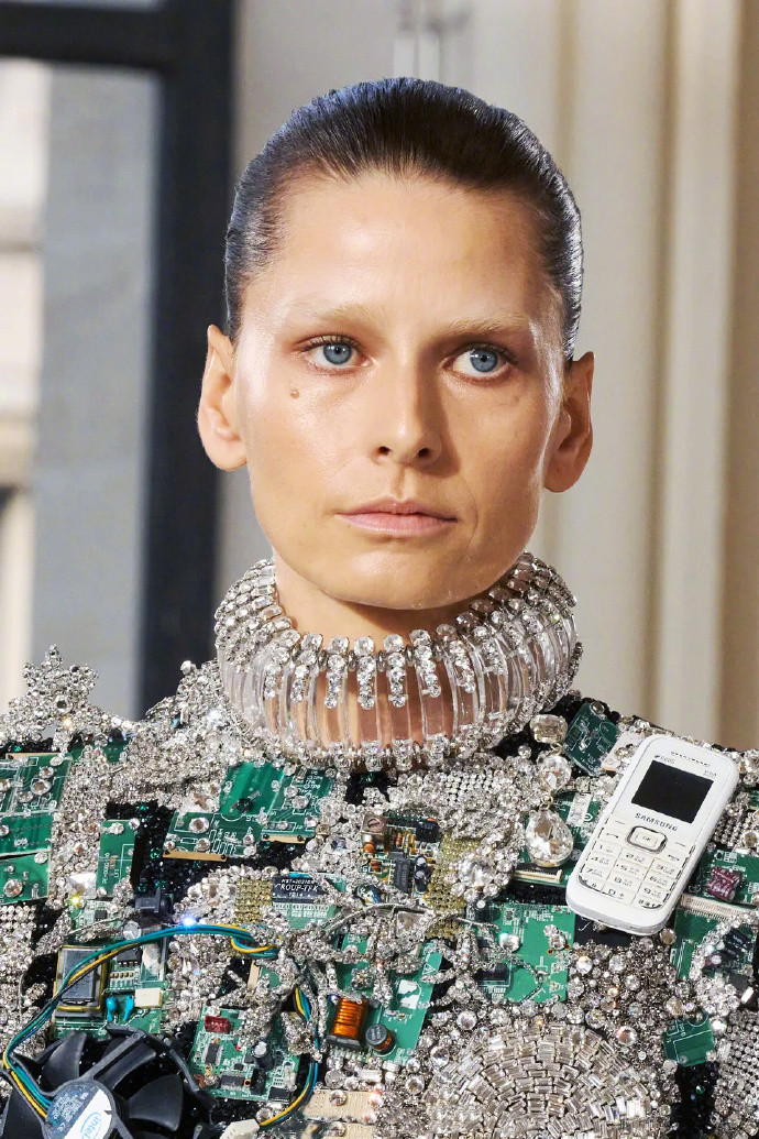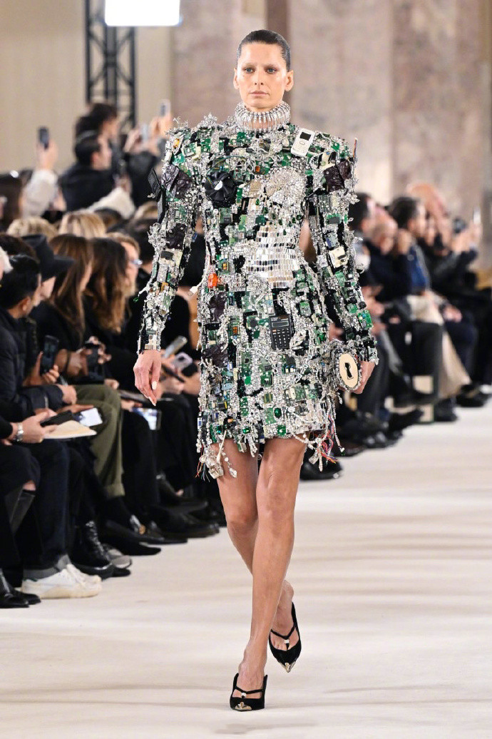 Daniel Roseberry将其命名为“The Mother”,翻盖手机、显卡主板、电线...礼裙上布满科技飞速发展后淘汰的古董电子元件,与华丽璀璨的水晶亮钻融合,摇身变成高定舞台上的时装,美丽同时更能唤醒旧时代的科技记忆。