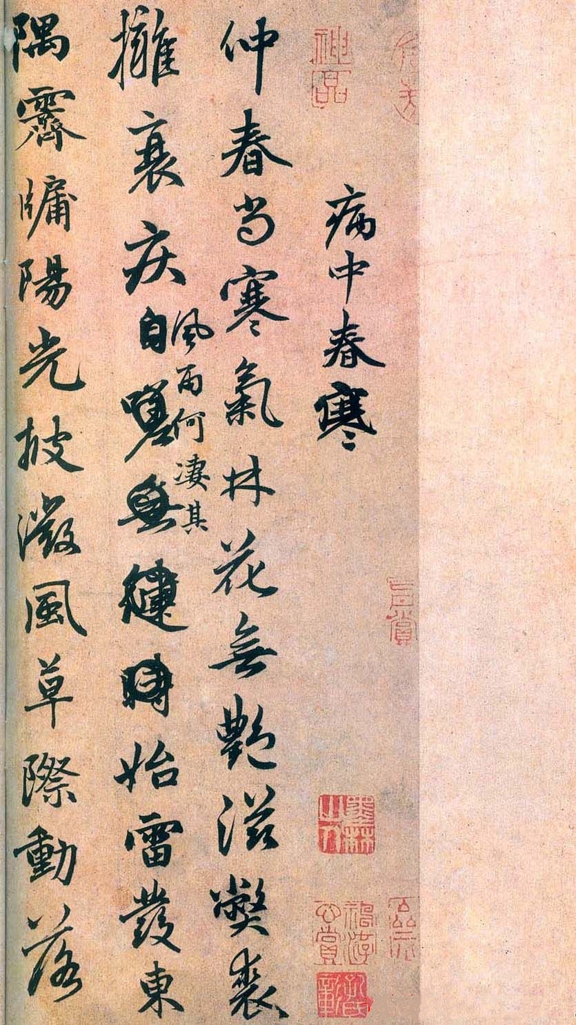 赵孟钜簧卧洌艘两兼,他虽为贵胄,但生不逢时,青少年时期南宋王朝已如大厦将倾,他在坎坷忧患中度过。他的父亲赵与告官至户部侍郎兼知临安府浙西安抚使,善诗文,富收藏,给赵孟钜院芎玫奈幕铡5悦项十一岁时父亲便去世了,家境每况愈下,度日维艰。宋灭亡后,归故乡闲居。元至元二十三年(1286年)行台恃御史程钜夫“奉诏搜访遗逸于江南”,赵孟畹仁嗳耍煌萍龈雷婧霰亓遥踔辆┏牵悦项立即受到元世祖的接见,元世祖赞赏其才貌,惊呼为“神仙中人”,给予种种礼遇,被任命为从五品官阶的兵部郎中,两年后任从四品的集贤直学士。至元二十九年 (1292)出任济南路总管府事;在济南路总管任上,元贞元年(1295),因世祖去世,成宗需修《世祖实录》,赵孟钅吮徽倩鼐┏恰?墒窃⒛诓棵苤刂兀耍凶灾鞯恼悦纤潮憬璨∑蚬椋那镏恢沼诘米挤祷乩鸲嗄甑墓氏缥庑恕U悦项在江南闲居四年,无官一身轻,闲情逸致与鲜于枢、仇远、戴表元、邓文原等四方才土聚于西子湖畔,谈艺论道,挥毫遣兴,过着与世无争的宁静生活。大德三年 (1299),赵孟畋蝗蚊椭毖列薪愕却θ逖峋伲傥凰湮奚ǎ酥安恍枥肟希胛幕缌得芮校喽匀逖哦惺剩冉鲜屎险悦项的旨趣,他一直干了十一年。至大三年(1310),赵孟畹拿朔⑸吮浠;侍影璋瘟Π舜锒运⑸诵巳ぃ菡悦项翰林侍读学士,知制诰同修国史,次年五月,爱育黎拔力八达即位,是为仁宗。他登基后不久,立即将赵孟钌佣品的集贤侍讲学士、中奉大夫。延祜三年(1316),元仁宗又将赵孟罱擦盅砍兄肌⑷俾淮蠓颍倬哟右黄贰V链耍允险治地位达到了一生中的顶峰。由于仁宗的青睐和赵氏艺术的出类拔萃,赵孟钔砟昝院眨“官居一品,名满天下”。