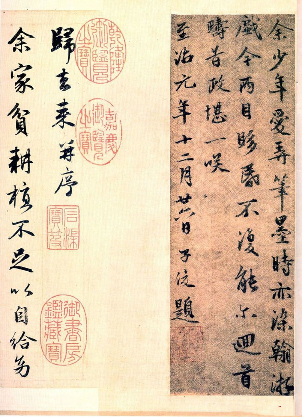 札一记事顿首再拜民瞻宰公仁弟足下,孟頫谨封。孟頫顿首再拜民瞻宰公仁弟足下、顷旆从一再过吴。何不蒙见过耶.孟頫滞留於此。未得至杭。想彼中事已定.昨承许惠碧盏。至今未拜赐。岂有所待耶。兹因仁卿来。草草数字附问。旦夕到杭。又有承教之便也。不宜。孟頫顿首再拜。十二月廿七日。赵孟頫书法尺牍《行书十札卷》合装长卷