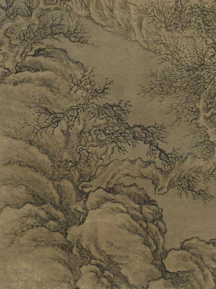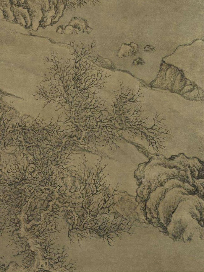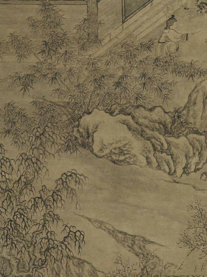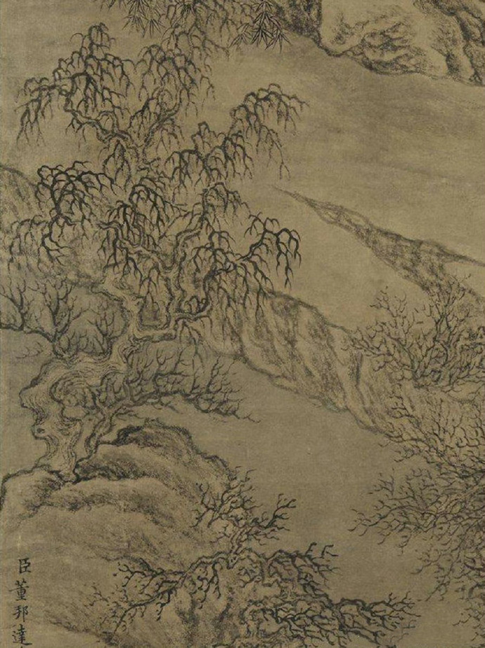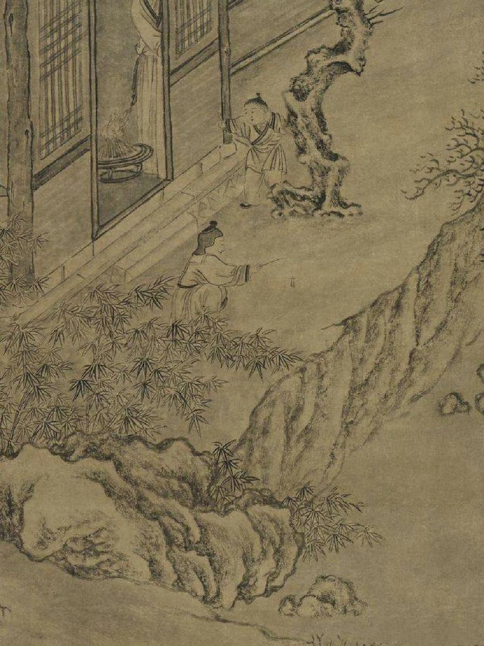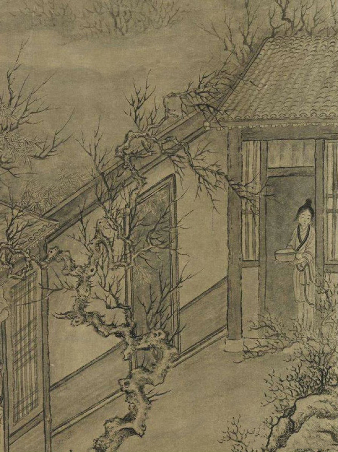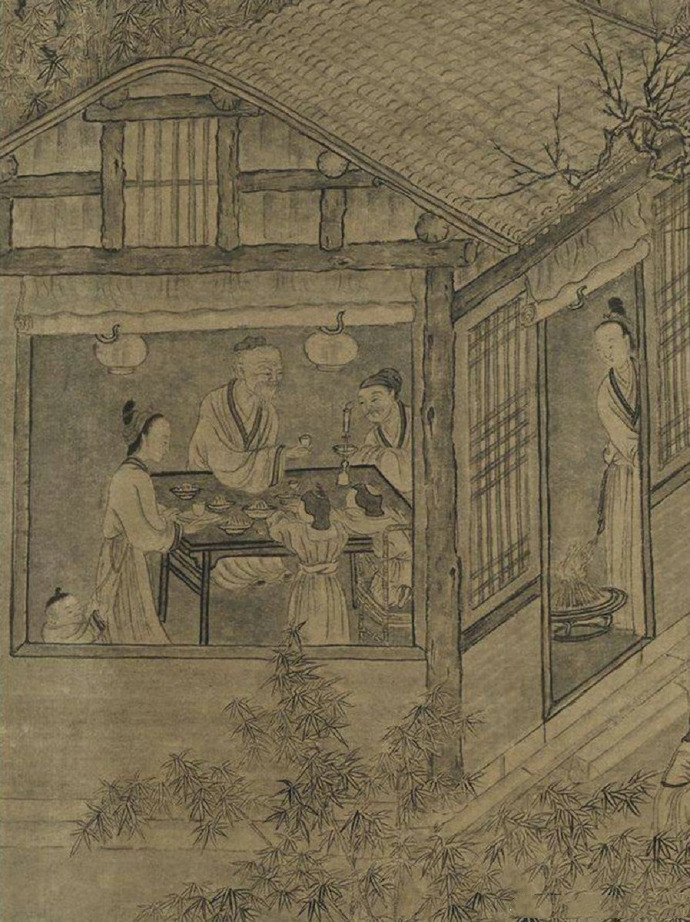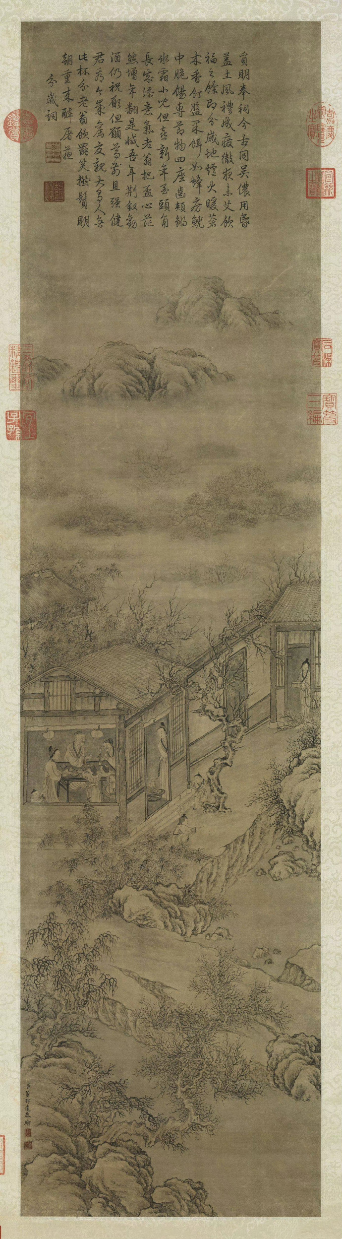 清 董邦达 《绘御笔范成大分岁词》 立轴,纸本,墨笔,112.9×28.7cm,台北故宫博物院藏。此作描写宋范成大〈腊月村田乐府〉其八〈分岁词〉:「礼成废撤夜未艾,饮福之余即分岁。」在夜间祭祀祖先,祭毕饮供神的酒,由幼而至长,祝颂而散,谓之「分岁」。茅屋内,筵席丰盛,长者将酒分与晚辈,屋外孩童放鞭炮玩乐,一派祥和欢乐。