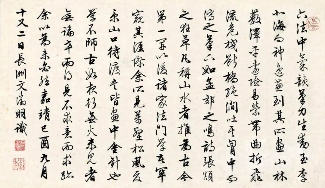六法中气韵笔力生动;至李北海,而神逸兼到,其所画山林薮泽,平远险易,萦带曲折,飞流危栈,断桥绝涧,吐其胸中而泻之笔下。如孟郊之鸣于诗,张颠之狂草,凡称山水者,必以成为古今第一,开以后诸家法门,学者罕窥见其涯际。余所见《万壑松风》、《夏景》、《山口待渡》卷 ,其皆画中金针也。学不师古,如夜行无火。未见者无论,幸而得见,不求意而求迹,余以为未必然。(嘉靖已酉九月十又二日,长洲文徵明识)