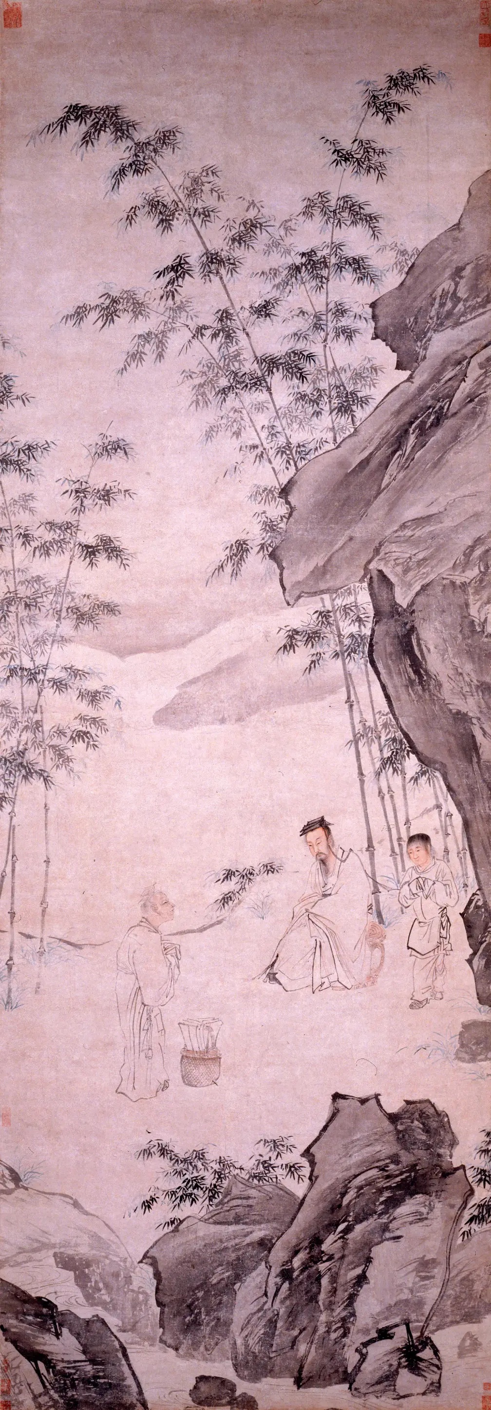 《柳下眠琴图》中,一位头上绑著折巾的士人倚靠著琴,正在休憩著,他前面放著一张白纸,似乎准备一有灵感就填上诗词。坡下有一名童子正负笈前来。本图的构图是采边角取景的方法,只画山坡的一角,松树则从左下延伸到右上,山坡及松树刚好形成两条对角线,而人物则被包覆在其中一个三角形内,形成稳定的三角形构图。