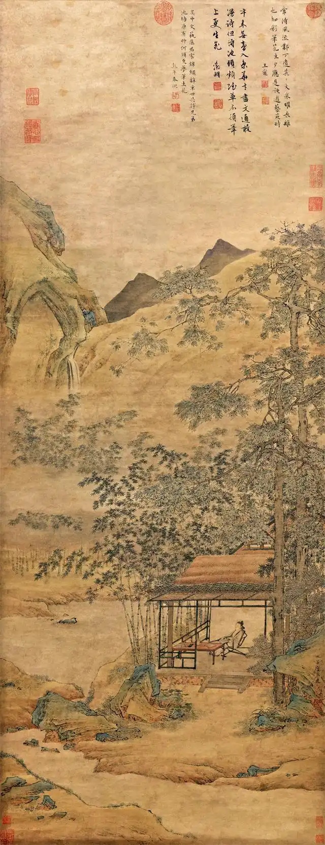 画一精舍,宽敞的书桌置于窗前,上置文具书籍,一士人半作半卧于躺椅上,神态安详。房舍四周修竹、梧桐摇曳生姿。坡石勾皴用拖泥带水法间乾笔皴擦,再以水墨淡淡晕染,颇见浑厚。上缀以萱花、丛菊,显示出隐居的悠雅情调。