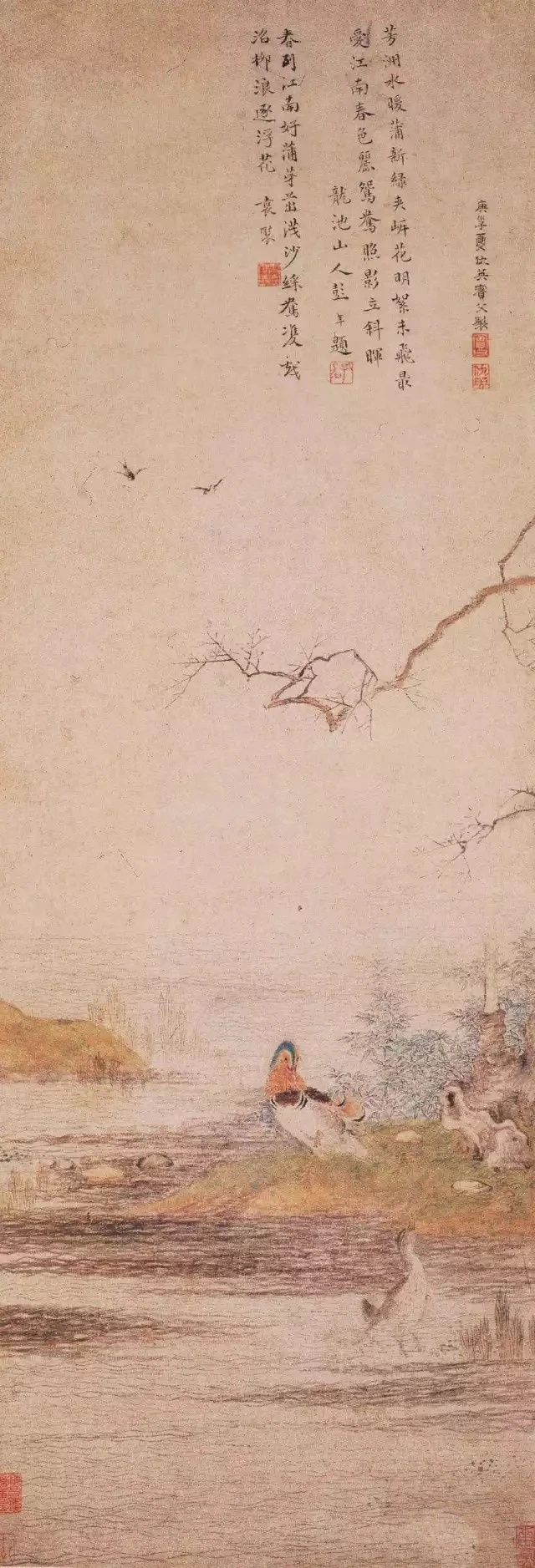 仇英较少作花鸟,但画必精工典丽。此图画水汀中栖一对鸳鸯,伴以奇花异石、沙汀竹篁,春意深浓。鸳鸯的姿态生动,颇费经营,刻画精致。图中大片春水,近处清澈见底,水草挺拔,生机勃勃。作者用笔皴擦柔和,敷色层次丰富浑融,深具宋人的写生功力与元人的笔意。图上有彭年、袁褧题诗。上署隶书年款“ 庚子(公元一五四○年)夏仇英实父制”,约为仇英五十岁时作。钤“实父”白文方印、“仇英”朱文方印,押角钤“十洲”朱文方印、“南阳”白文方印。