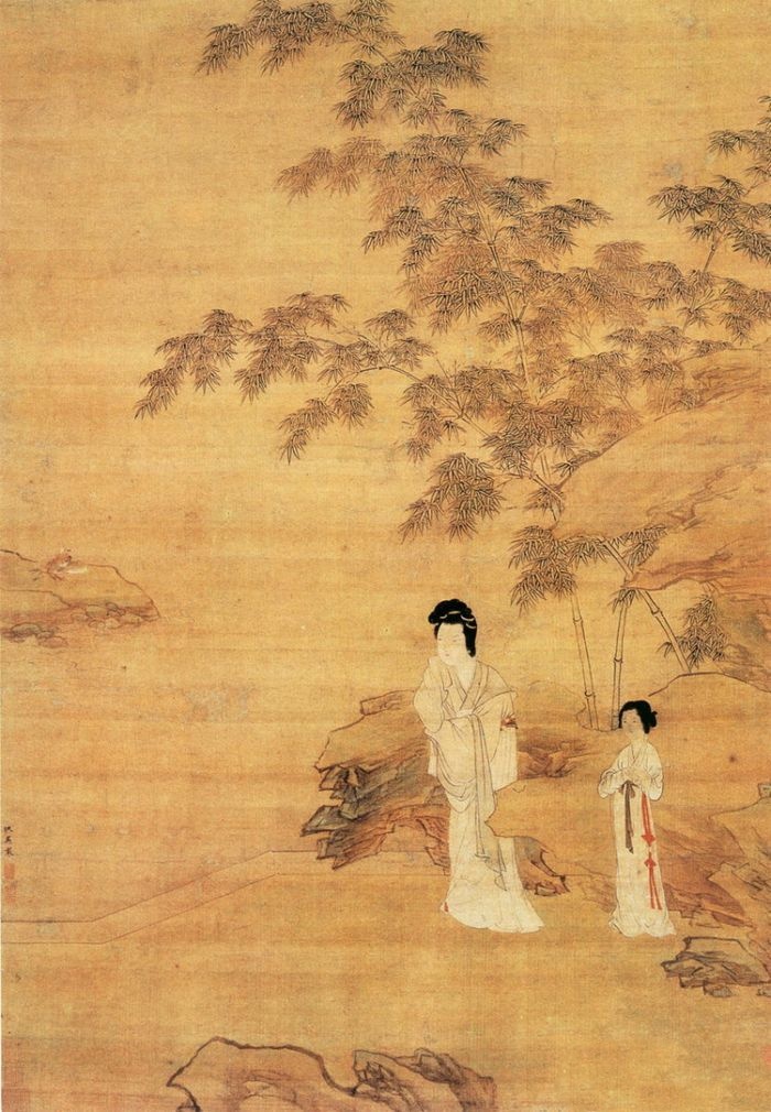 此图工整纤丽,飘逸优雅。庭院内修篁疏淡,奇石卧立,一仕女,宽袖长裙,信步闲踱,凝视远方。画家用细腻的笔墨,刻画仕女脉脉含情的心理状态,也透露出其空虚、无聊的精神面貌。此图吸收唐宋仕女画的技法,人物线条用兰叶描而又稍细,劲挺流畅。高耸的发髻,丰满的体态,似周昉笔下的唐代贵族妇女形象。