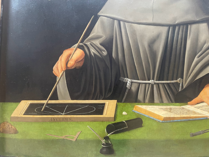 画的是影响文艺复兴绘画技巧的《神圣比例》作者帕乔里,身旁是他的贵族子弟学生。丢勒曾在威尼斯向巴尔巴里求教,并第一次看到根据测量来画人物。他精通数学的“理念世界”,几何画法,寻求人体结构的秘密。